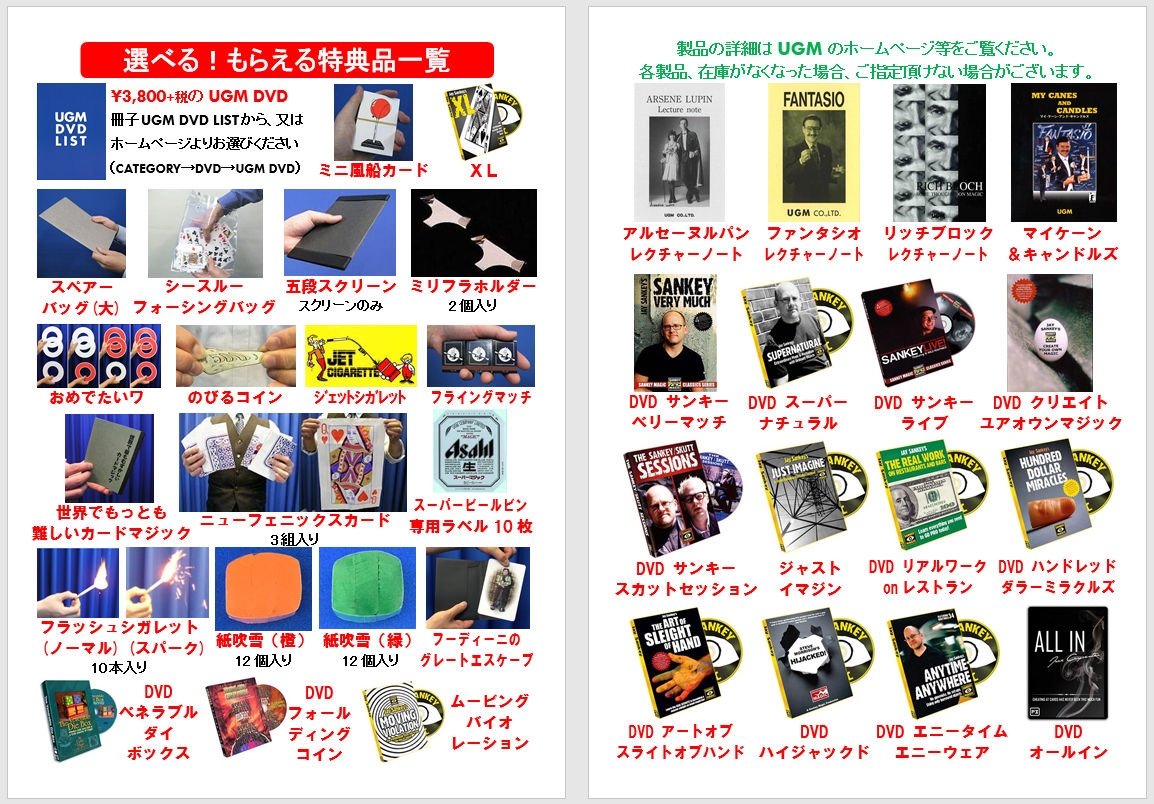 毎回UGM最新情報と一緒に様々な製品の演技動画や一流マジシャンによるレクチャーを収録したDVDもお送りいたします!